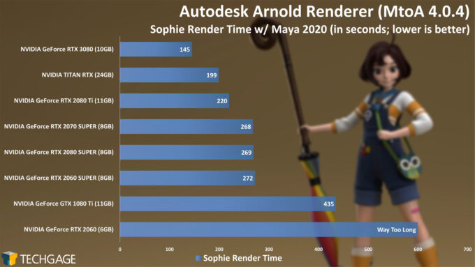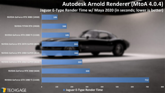 Arnold của Autodesk sử dụng OptiX theo mặc định, có nghĩa là bất kỳ GPU nào có lõi RT sẽ tự động vận hành chúng, dẫn đến một số hiệu suất tuyệt vời. Trong kết xuất E-Type, RTX 3080 nhanh hơn nhiều so với TITAN RTX và nhanh hơn đáng kể so với 2080 SUPER.