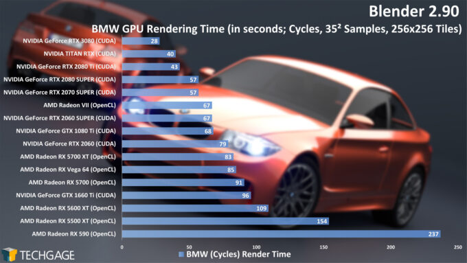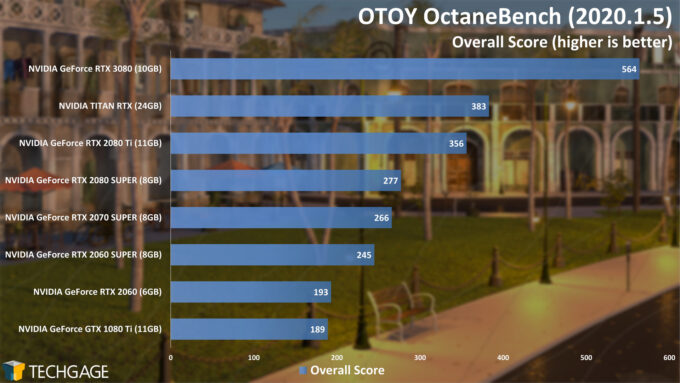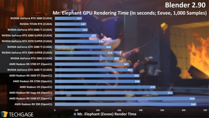 Ngay cả khi không tăng tốc RTX, tốc độ nhanh hơn 14% đối với RTX 3080 so với TITAN RTX không có gì đáng ngại. So với 2080 SUPER, RTX 3080 nhanh hơn 35% trong Eevee. Trong khi chúng tôi đang thử nghiệm một ứng dụng duy nhất vẫn còn ở đây, hiệu suất này trực tiếp mở rộng với kết xuất hoạt ảnh với số lần lặp nhỏ hơn.