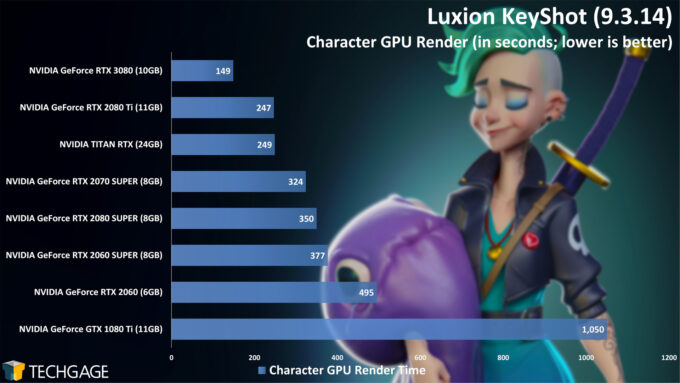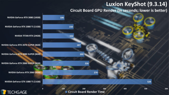 KeyShot với RTX 3080 nhanh hơn 40 ~ 50% so với 2080S. Ấn tượng hơn, nó nhanh hơn 80% so với 1080 Ti dựa trên Pascal cũ hơn trong kết xuất Bảng mạch và nhanh hơn 86% với kết xuất Character.