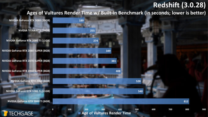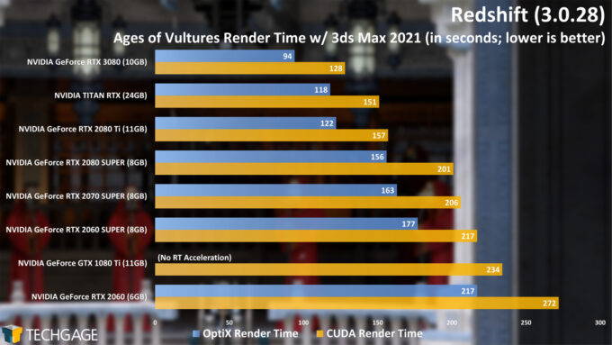Với cảnh Age of Vultures phức tạp hơn nhiều , RTX 3080 đã cải thiện hiệu suất đáng kể ở cả CUDA và OptiX so với TITAN RTX. Thật kỳ lạ khi so sánh GPU $700 này với GPU $2.499 của thế hệ trước, vì vậy nếu chúng tôi đưa 2080 SUPER $699 vào kết hợp, RTX 3080 có thể nhanh hơn 40% khi sử dụng OptiX.