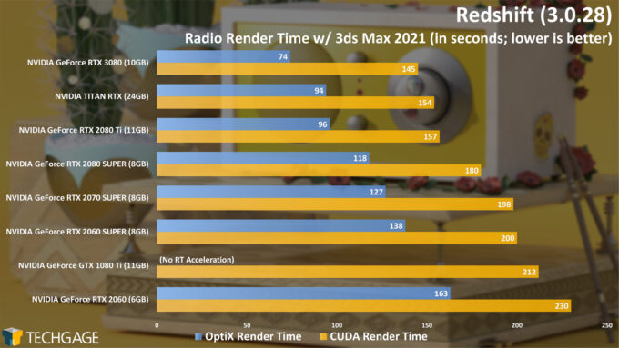 Với kết xuất Radio đơn giản hơn, RTX 3080 chỉ tỏ ra nhanh hơn một chút so với TITAN RTX với CUDA, nhưng OptiX đã vượt qua điều đó để đạt được mức lợi nhuận tốt hơn nhiều, bằng chứng về thiết lập lõi RT mạnh hơn nhiều trong Ampere.