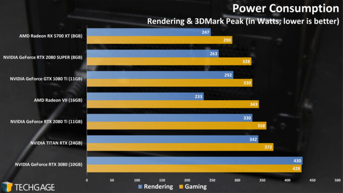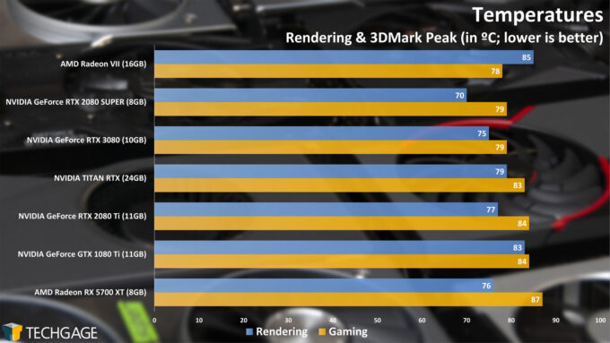 Thử nghiệm năng lượng đã tiết lộ một vài kết quả thú vị: RTX 3080 sử dụng cùng một lượng điện năng bất kể chúng tôi đang chạy kết xuất hay những trò game phức tạp. Điều thú vị là Radeon VII sử dụng ít năng lượng hơn trong khi kết xuất so với chúng tôi mong đợi, nhưng nó vẫn đạt đỉnh với nhiệt độ cao nhất trong cùng một thử nghiệm.