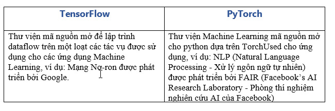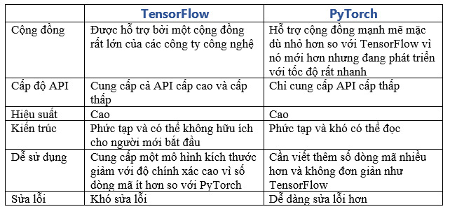 - Cả TensorFlow và PyTorch đều là nguồn mở nhưng được phát triển bởi hai nhân vật khổng lồ khác nhau trong công cuộc đổi mới công nghệ: Google và Facebook và được sử dụng cho các ứng dụng Machine Learning như Mạng Nơ-ron. Nhưng, lợi thế của PyTorch so với TensorFlow nằm ở hai tính khác biệt: