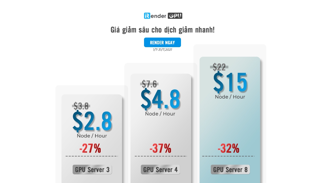 2. iRender cung cấp cấu hình high-end với mức giá hợp lý. Bạn có thể thấy rằng gói server của iRender luôn có giá rẻ hơn nhiều so với các gói của các render farm khác (trên tỷ lệ hiệu suất/giá cả). Hơn nữa, khách hàng của iRender sẽ được hưởng nhiều chương trình khuyến mãi và giảm giá hấp dẫn. Ví dụ: trong tháng 7 này, chúng tôi giảm giá gói cho GPU Server 3 và các server khác, người dùng sẽ tận dụng chúng để nâng cấp render của họ.