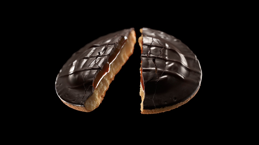 Cảnh sô cô la thậm chí còn khó khăn hơn vì cả bánh quy và sô cô la trên đầu đều bị gãy và cần phải căn chỉnh hoàn hảo. Sau đó, có những lúc logo được chạm nổi trên bánh quy là khác nhau, vì vậy chúng tôi phải thiết kế một cách thật tổ chức để giữ tất cả phiên bản của bánh quy ở dạng ban đầu. Anh nói thêm: “Chúng tôi đã thử rất nhiều kỹ thuật khác nhau để có sự đa đang trong các vết gãy, nó phải trông thật và tự nhiên để khách hàng hài lòng.”