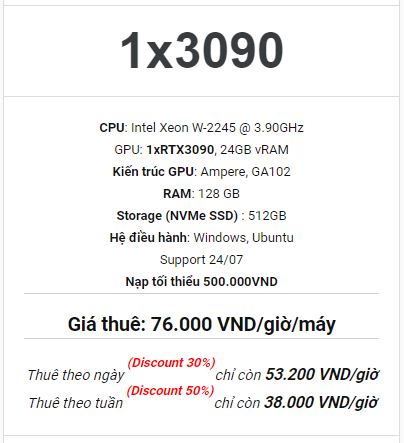 Với CPU Intel Xeon W-2245 mạnh mẽ và card đồ họa mạnh nhất hiện nay RTX 3090, khách hàng sẽ được trải nghiệm cấu hình nâng cấp chỉ với 76.000 VND/giờ/máy.