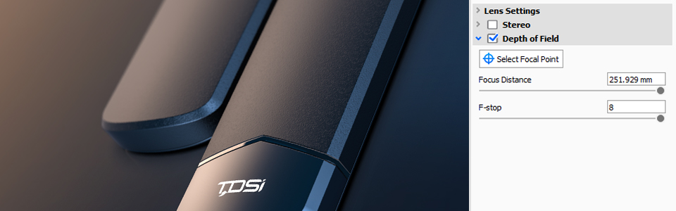 Sử dụng depth of field (độ sâu trường ảnh) có thể bắt chước gần giống hiệu ứng do máy ảnh SLR tạo ra. Nó thu hút sự tập trung của người quan sát vào mô hình và làm mờ nền hoặc các phần của mô hình ở xa hơn. Hiệu ứng này thường thấy trong ảnh macro mà phần được lấy nét rất nhỏ hoặc rất gần máy ảnh.