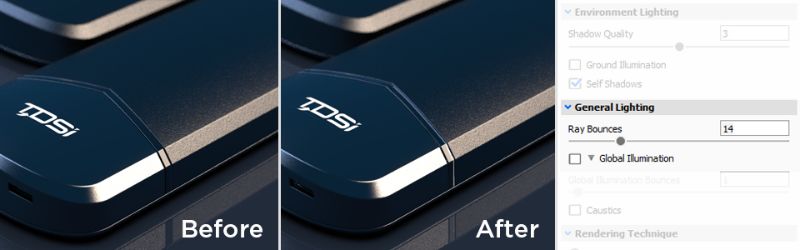 Đối với các vật thể trong suốt bằng polycarbonate hoặc thủy tinh, việc tăng số lượng ray bounces sẽ giúp tăng độ trong của vật liệu. Tăng độ nảy tia cũng giúp đạt được hiện tượng chảy màu khi vật liệu có màu rực rỡ nằm trong mô hình liền kề. Hãy nghĩ về điều này giống như hiệu ứng buttercup.