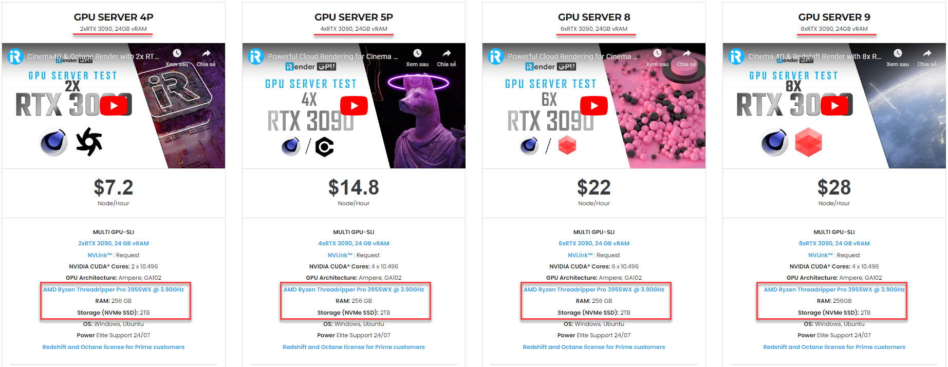 Tại iRender, chúng tôi có nhiều gói server đa GPU RTX 3090 mạnh mẽ, chắc chắn sẽ đẩy nhanh tốc độ render cho Redshift. Các server đa GPU của chúng tôi bao gồm 2/4/6/8x RTX 3090 đều được trang bị CPU khỏe, là AMD Ryzen Threadripper Pro 3955WX. CPU này cho phép bạn trích xuất dữ liệu mesh, tải textures và load dữ liệu scene nhanh hơn. Hơn nữa, các gói máy này đều có 256GB RAM, và dung lượng ổ cứng SSD NVMe 2T. Tất cả các máy đa GPU của iRender đều cho tốc độ render Redshift nhanh hơn bao giờ hết.