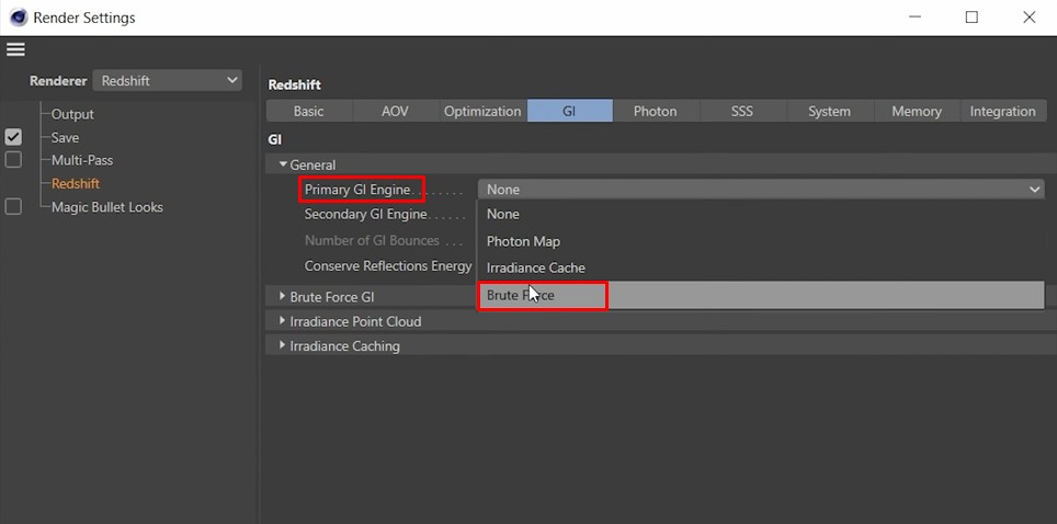 Bước tiếp theo là đặt Primary GI engine thành “Brute Force” để chiếu sáng toàn cầu.