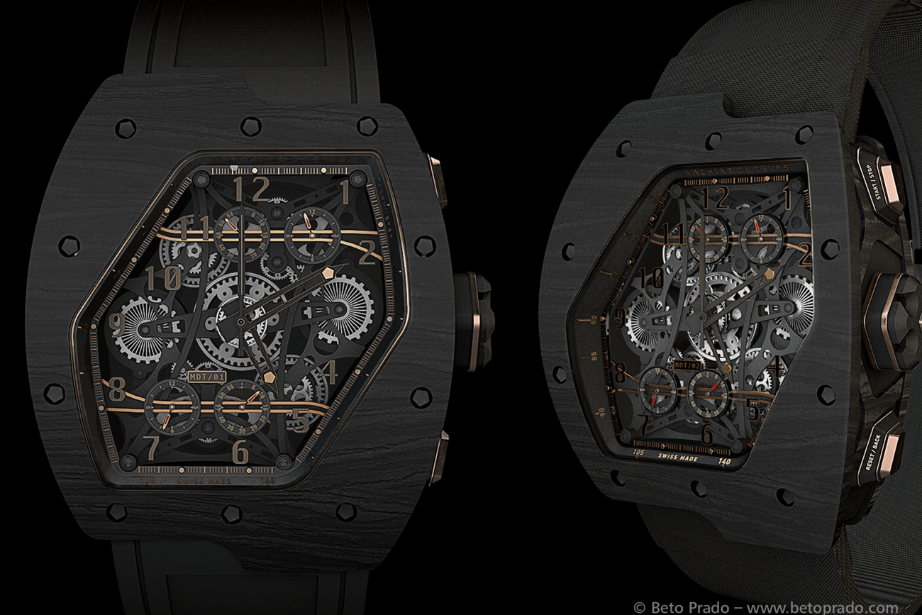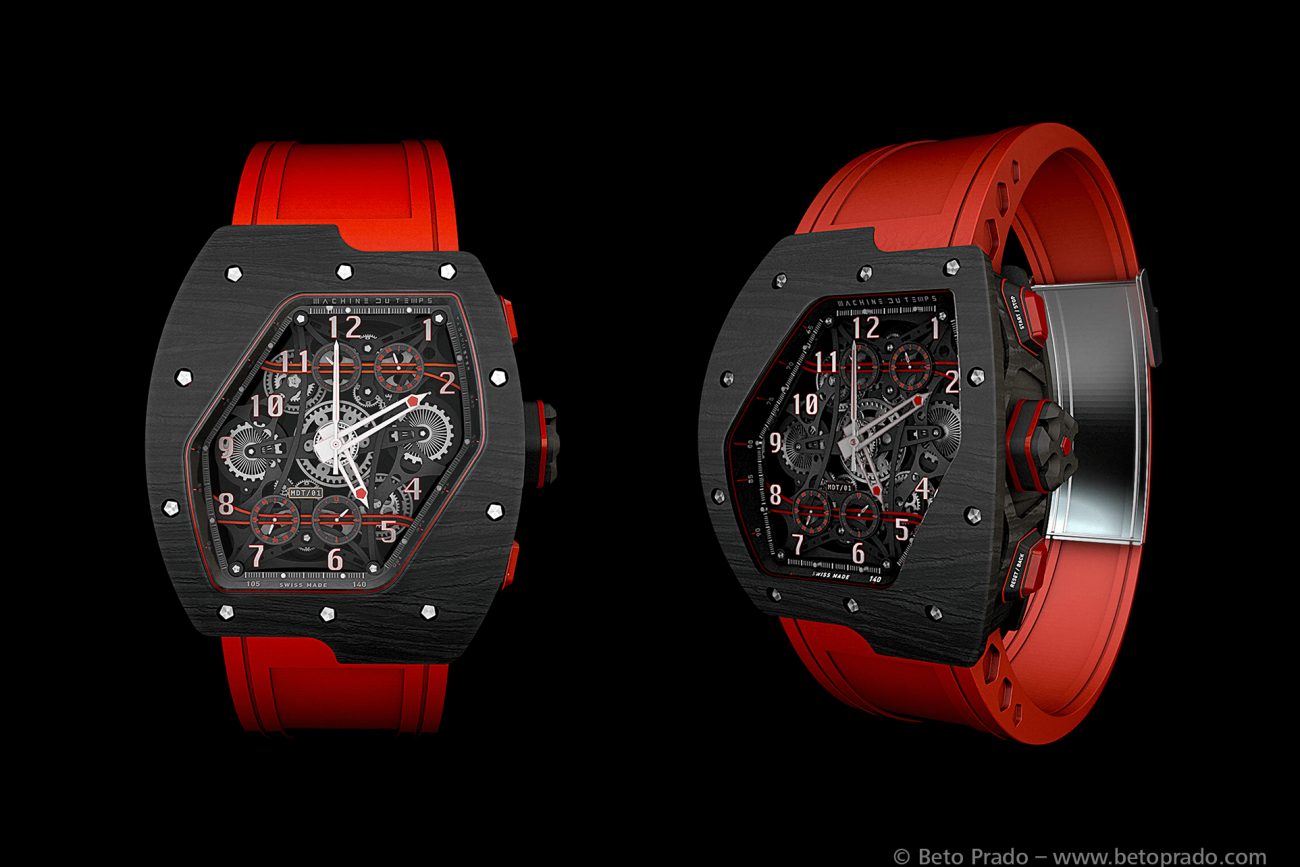 Khi nói về khái niệm tạo hình minh họa cho các sản phẩm mới, thì những phương pháp truyền thống sử dụng 2D như Photoshop & Illustrator sẽ có giới hạn trong việc thể hiện. Nếu bạn thực sự mong muốn cho các nhà đầu tư tiềm năng có thể thấy được sản phẩm được xây dựng ra sao, hoạt động thế nào, thì bạn cần tạo ra nó trong không gian 3D. Đó là lý do vì sao mà nghệ sĩ, nhà thiết kế, nhà kiến trúc 3D người Brazil là anh Beto Prado được giao nhiệm vụ tạo ra hình ảnh của chiếc đồng hồ đeo tay theo phong cách mới cho công ty khởi nghiệp Machine du Temps. Hãy xem những sản phẩm hoạt hình dưới đây.