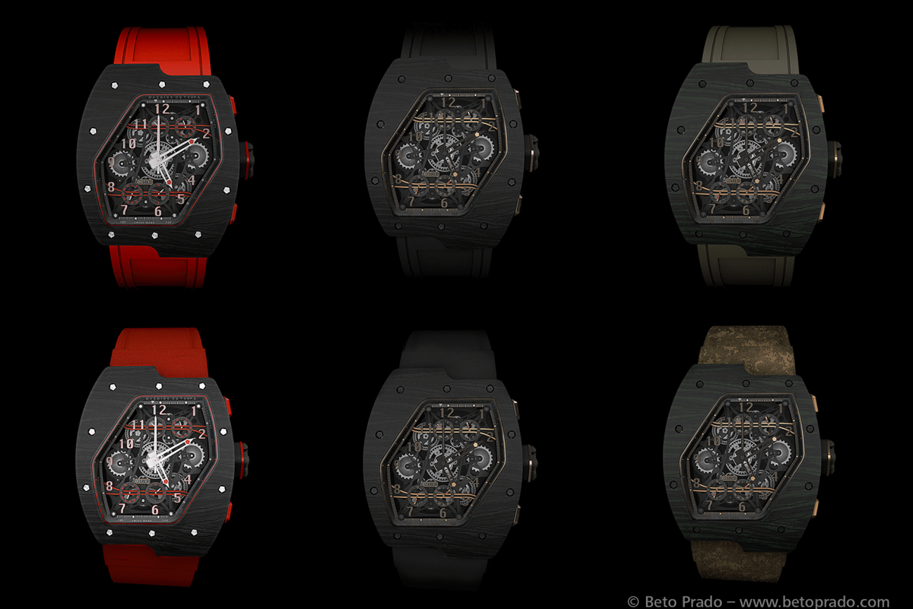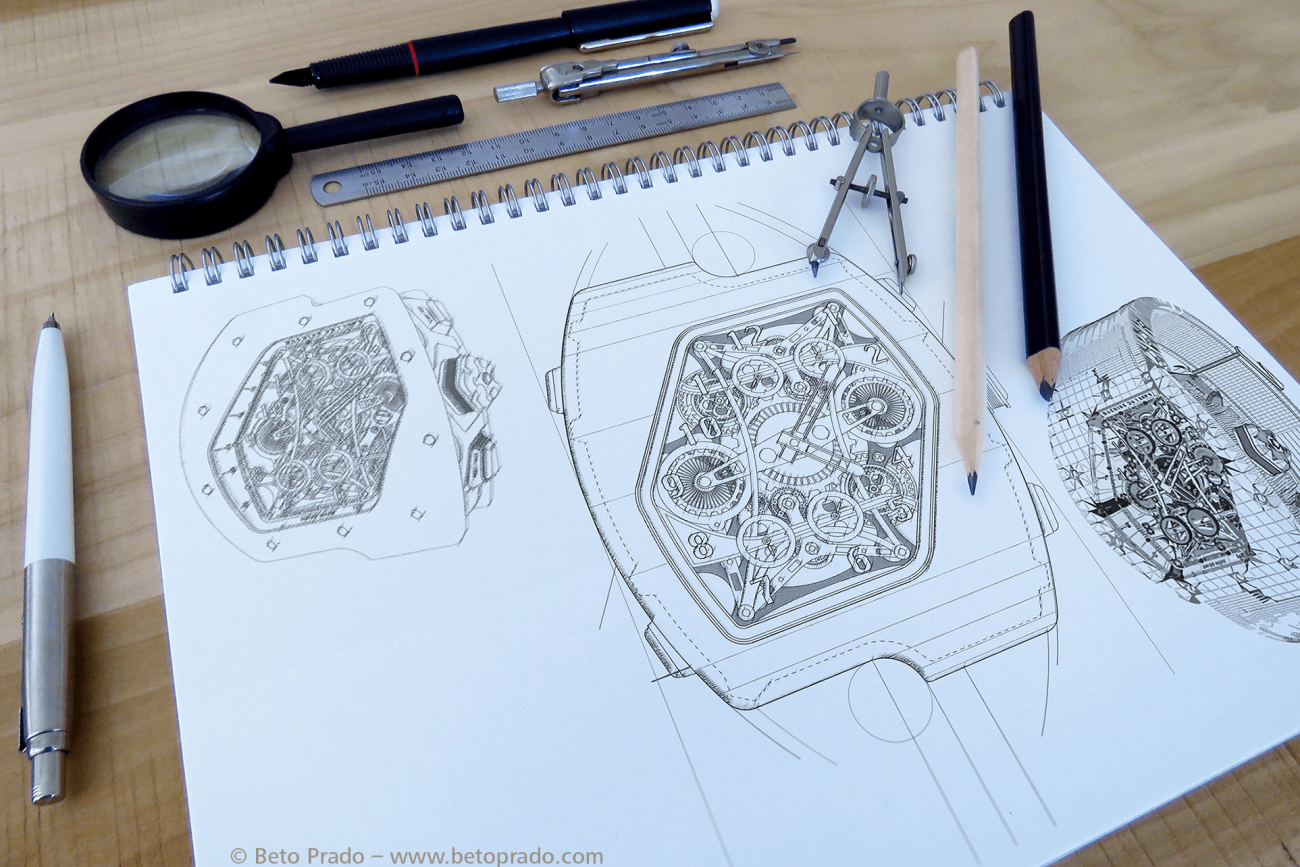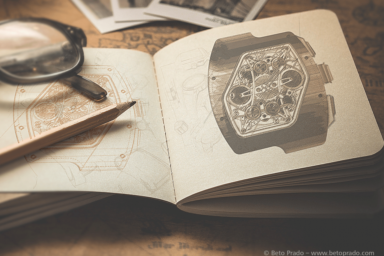 Lấy cảm hứng từ những thương hiệu đồng hồ nổi tiếng, những chiếc xe Công thức 1 và những đặc điểm độc đáo của Máy bay ném bom tàng hình B-2, trước tiên Prado đã vẽ những hình ảnh tưởng tượng của mình trên giấy. Sau đó anh ấy đã sử dụng Cinema 4D và After Effects để tạo hình và tạo hiệu ứng cho ý tưởng về chiếc đồng hồ tương lai mục đích quảng cáo nó với khách hàng.