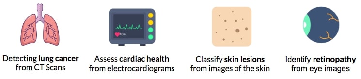 Vì vậy, Học máy đặc biệt hữu ích trong các lĩnh vực mà thông tin chẩn đoán bác sĩ kiểm tra đã được số hóa. Như là: