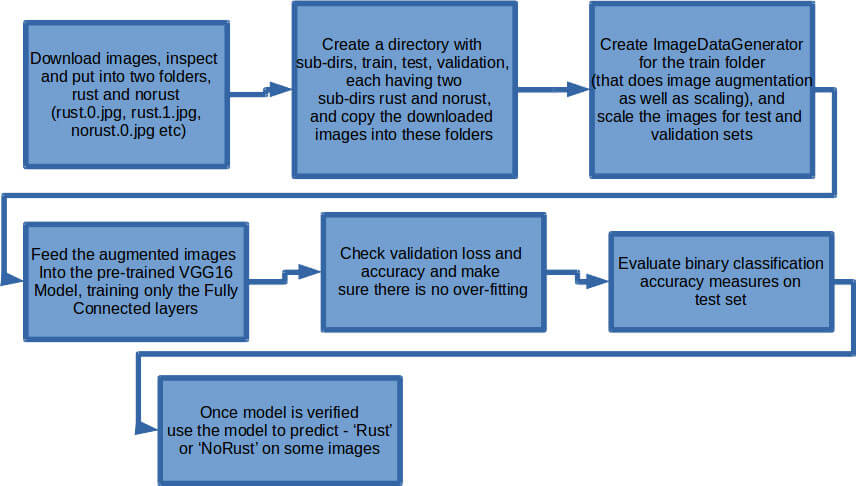 Chúng tôi giải quyết vấn đề này như một quá trình hai bước. Đầu tiên, chúng tôi sử dụng Deep Learning với các pre-trained model, để thực hiện phân loại hình ảnh nhị phân – những hình ảnh có ‘rỉ sét’ và những hình ảnh ‘không rỉ sét’. Thật ngạc nhiên, điều này hoạt động rất tốt. Khi chúng tôi xác định hình ảnh bị rỉ sét, chúng tôi sẽ phát triển một deep learning model để vẽ hộp giới hạn xung quanh vết rỉ sét, sử dụng Object Detection API với TensorFlow.