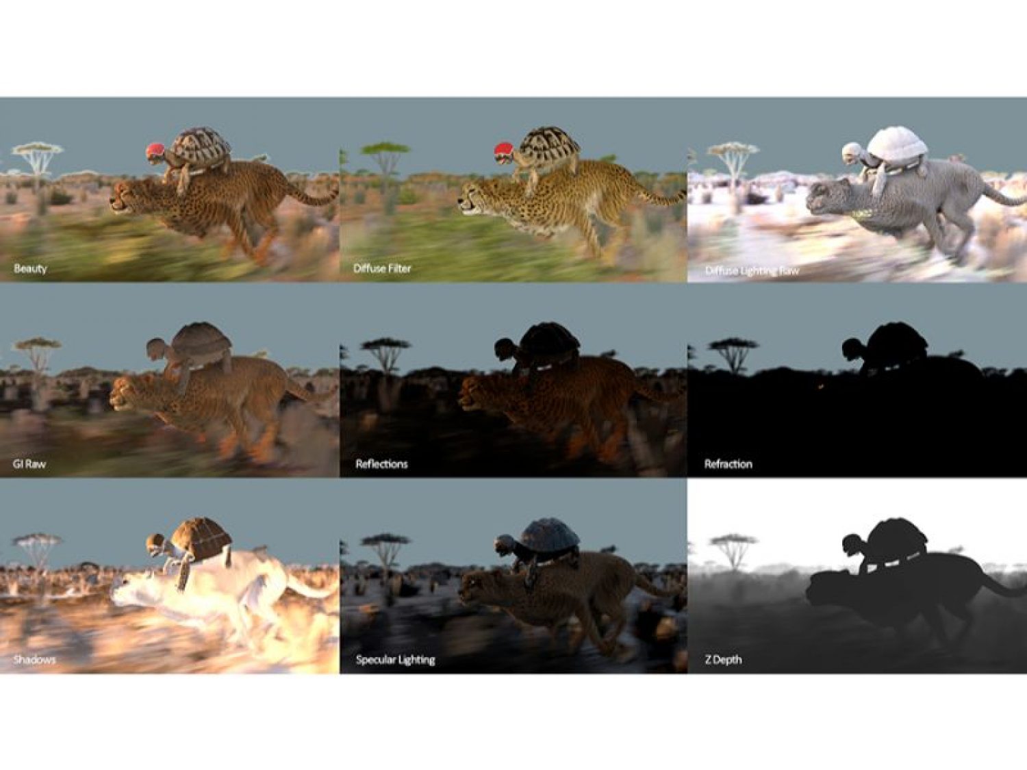 Bắt một con rùa cưỡi báo Gêpa cũng không phải là nhiệm vụ dễ dàng bởi vì vai và cột sống của báo Gêpa uốn cong và nâng lên nhiều lần mỗi giây trong khi chạy nước rút. Đó là một chuyến đi khá kinh hoàng đối với một con rùa và sẽ tạo ra một chuỗi cảnh trông rất kỳ cục. Vì vậy, vì mục tiêu của câu chuyện, nhóm nghiên cứu đã vô hiệu hóa các chuyển động của con báo bằng cách ổn định vai và cột sống cho con rùa táo bạo kia . Đội ngũ của MAKER cho biết cách làm đơn giản này không chỉ làm sinh động thêm các layers mà còn đáp ứng được các tiêu chuẩn khắt khe về mặt thời gian.